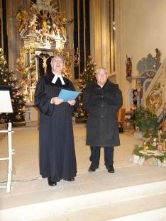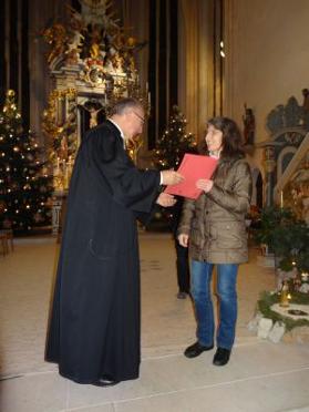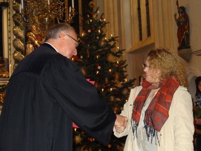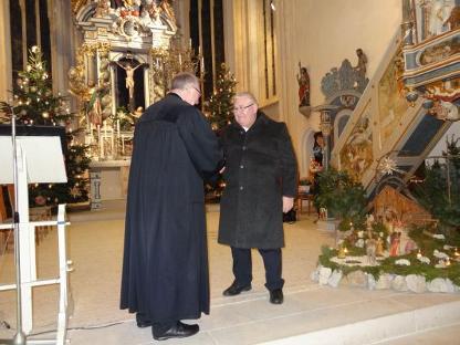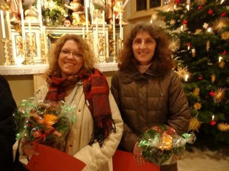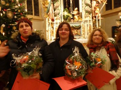 Friedrich Riffelmacher und Hermann Eitel wurden beide vor 40 Jahren als Lektoren zum Dienst beauftragt und eingeführt. Lektoren werden gebraucht und die ehrenamtlichen Einsätze, an Sonn– und Feiertagen sind „zahlreich“. Pfarrer Eichinger dankte für ihren Dienst und überreichte ein kleines Geschenk. Die Damen vom Kindergottesdienst-Team: Elisabeth Reichel, Micha Böhmländer, Ramona Reizammer, Doris Stiegler, Dagmar Schweigert, Stefanie Grauf und Annelie Seefried (war nicht anwesend) sind alle seit langer Zeit mit großer Hingabe für den Kindergottesdienst tätig. Auch ihnen dankte Pfarrer Eichinger und überreichte eine Urkunde und Blumen. |