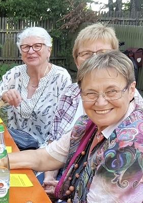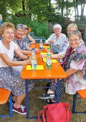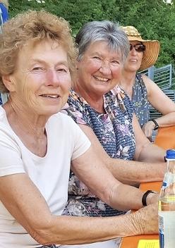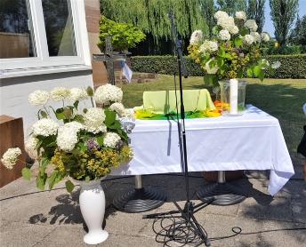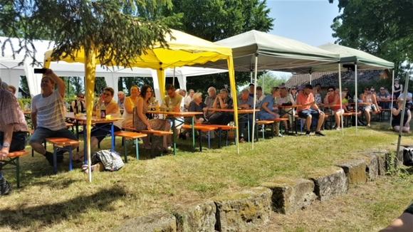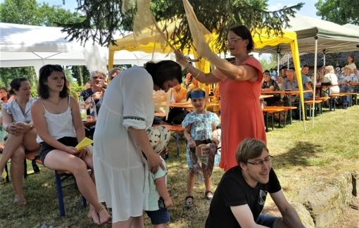 Wie seit langem ist der beste Platz zum fröhlichen Beisammensein die große Wiese vor dem Gemeindehaus – genug Platz für Tische und Bänke und Sonnenschirme und Zeltdächer - gute Sicht auf den Altar und alles, was sich da vorne abspielt und – S-c-h-a-t-t-e-n.