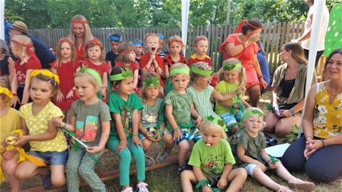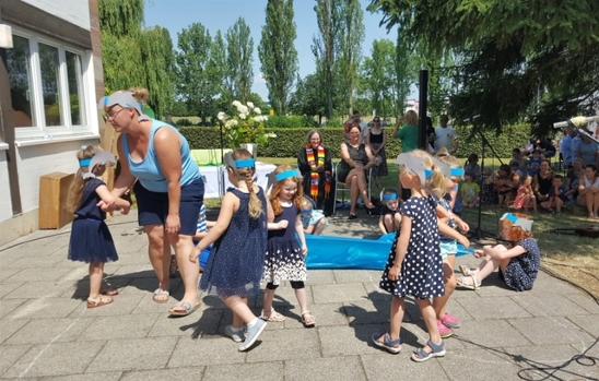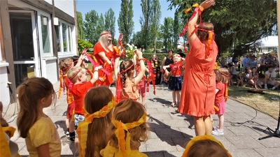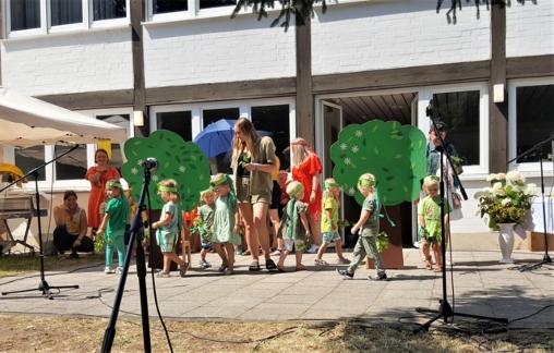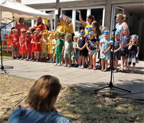 Die Kinder stellten mit Liedern und Tänzchen dar, wie Gott die Welt „kunterbunt“ ausgestaltet hat. Mit Rot – dem Zeichen für Liebe, mit dem Gelb der Sonne, der Ernte und letztlich auch der Dankbarkeit, mit Grün – der Farbe der Bäume und der Pflanzen und der Hoffnung, mit Blau für das Wasser und für die Ruhe und die Treue.