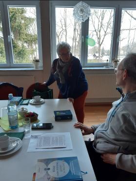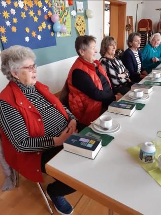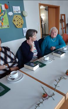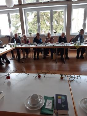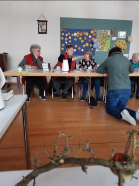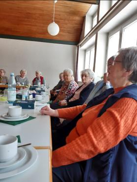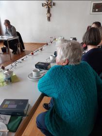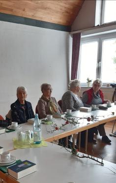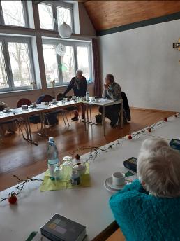 Gespannt warten wir auf Herrn Pfarrer Schäfer, da wir ihn nicht kennen und er Frau v. Rotenhan während ihrer Krankheit vertritt. Unscheinbar und nicht direkt Pfarrer, eher Schuljunge ist seine Erscheinung. Aber dann erzählt er von sich und wir lauschen , ganz still wird es im Saal.