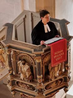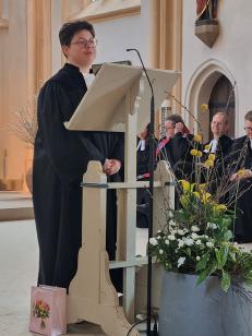 Mit besonderer Spannung wurde natürlich die Predigt von Frau Rebecca Schüler erwartet: . „Was sagt man in solchem Moment?“ So begann sie, verwarf dann gleich den Gedanken, von guten und nicht so guten Entscheidungen in ihrem Leben zu berichten - und kam dann zu ihrem Konfirmationsspruch: „Durch Gottes Gnade bin ich, was ich bin!“ Im Rückblick weiß sie, dass da jemand mitgesprochen hat in ihrem Leben: Gottes Gnade, dass ER „Ja!“ sagt zu mir. Ich muss mir nichts verdienen. Es hängt nicht alles an mir, ich muss nicht alles selber machen. So wie Paulus es ausdrückt: SEINE Gnade ist nicht vergeblich, sie setzt etwas in Bewegung. Ich bin nicht allein. Die Kirche ist ein sicherer Ort für alle. Sie ist lebendig, wenn sie sich auf den Weg macht. Also freut sich Frau Schüler besonders auf die Arbeit mit den Konfirmanden. „Ich möchte unterwegs sein, vieles lernen und die Kirche von morgen mitgestalten.“