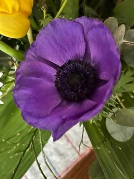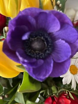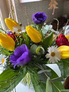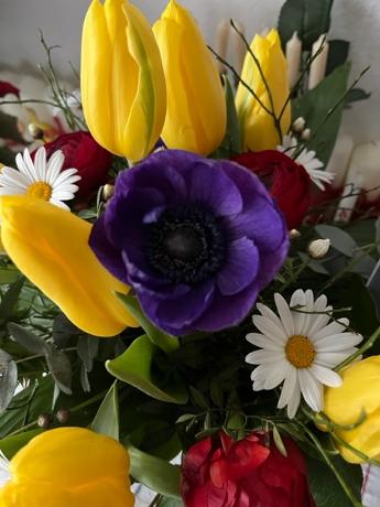 Die Farbe der blau/lila Anemonen steht für evangelisch-lutherisch - meine religiöse Heimat - die gelben Tulpen für meine Katholizität, das ROT für meine Liebe zu Jesus Christus unserem HERRN und Heiland - und die Margarite bin ich, denn ich heiße Margit und das kommt von Margarete und das bedeutet „die Perle“!