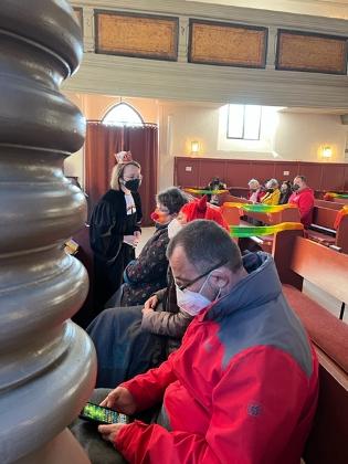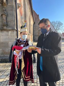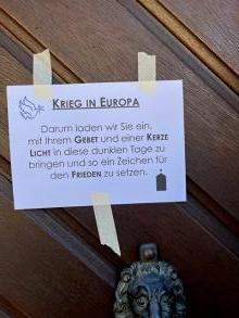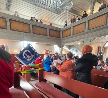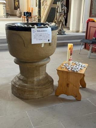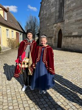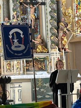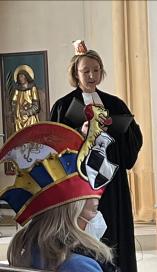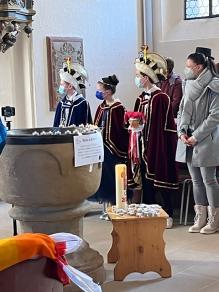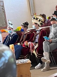 Am Beginn des Gottesdienstes stand das Gedenken an die Menschen im Krieg. Gleich beim Eintreten hatten Besucher/innen Kerzen am Taufstein angezündet und ein Gebet gesprochen. „Von guten Mächten wunderbar geborgen..“ Die Melodie dieses Liedes – von Herrn Bien auf seiner Posaune gespielt, erinnerte daran, dass es Gott ist, dem wir uns in unseren Sorgen und Ängsten anvertrauen können. Der Bitte um Frieden in der Ukraine galt auch das Gebet, das das Kinderprinzenpaar gemeinsam sprach.