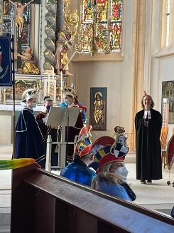 Aber natürlich prägte auch der Fasching mit seiner Musik, seinen Bräuchen große Teile des Gottesdienstes. Da war der Einzug des Faschingskomitees von schwungvoller Blasmusik und vom Klatschen der Leute begleitet. Immer wieder ertönte der Erlbacher Faschingsruf: Erba-AHAA!! Erba-AHAA! Frau Vikarin Breunig erhielt für die Gestaltung dieses speziellen Gottesdienstes von der Präsidentin Andrea Tiefel den Faschingsorden „Elfi“, den sie jetzt zusammen mit der kleinen Narrenkappe zu ihrem Talar trug.