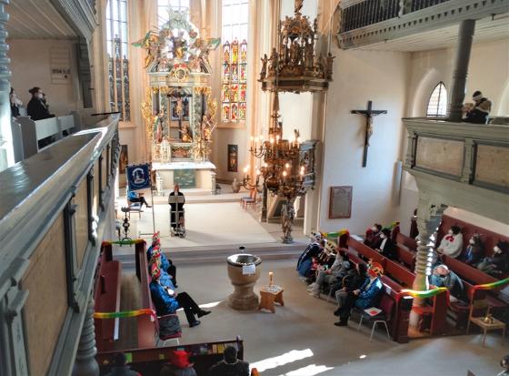 Viele Menschen haben sich zu diesem Gottesdienst einladen lassen. Bis auf den letzten „erlaubten“ Platz war die Kirche besetzt. Alle kamen maskiert (na klar! Corona), viele dazu auch verkleidet, darunter die „Kappen- und Ordensträger“ des Markt Erlbacher Faschingskomitees. Insgesamt bot das Kirchenschiff so ein fröhlich-buntes Bild – angestrahlt von hellem Sonnenschein.
