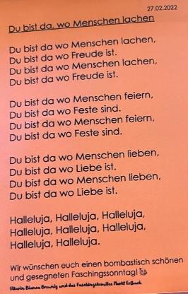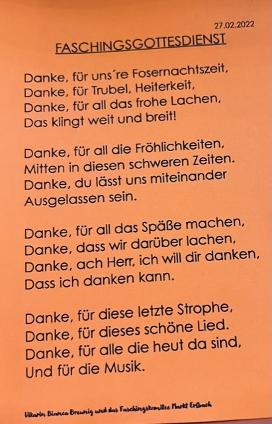 „Danke für unsre Fosernachtzeit Danke für Trubel, Heiterkeit…..“ sang dann die Gemeinde nach einer bekannten Melodie.