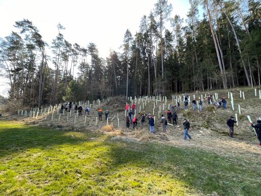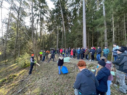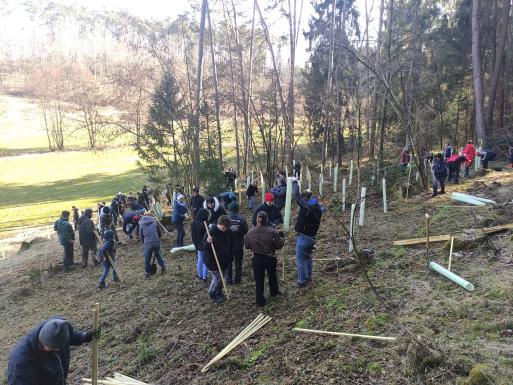 Als Teil von Gottes Schöpfung gestalteten wir Gottes Schöpfung: Hand in Hand, groß und klein, alt und jung – viele unterschiedliche Teams fanden sich zusammen, schlugen unter Aufwendung aller zur Verfügung stehender Kräfte Löcher in den vereisten Waldboden, setzten Ahorn- und Buchensprösslinge und sorgten für den nötigen Schutz der Jungbäume.