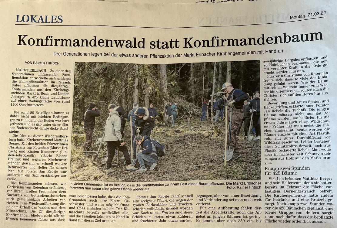 Gott belohnte uns mit strahlendem Sonnenschein, einer wunderbaren Stimmung unter allen Beteiligten und einem Erlebnis, an das wir noch lange zurückdenken werden - vor allem unsere Konfis, die bei ihrem Jubelkonfirmation in 25 oder 50 Jahren nach dem Mittagessen in den Wald spazieren können um zu schauen, was aus „ihren“ Bäumen geworden ist.