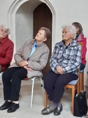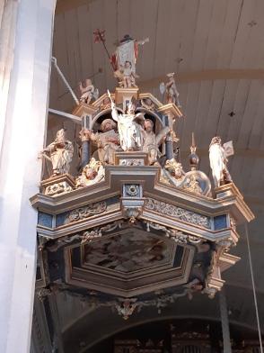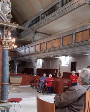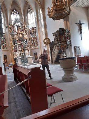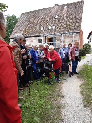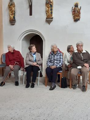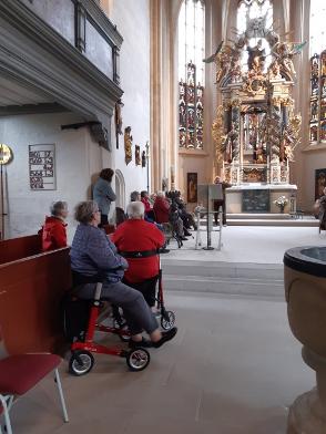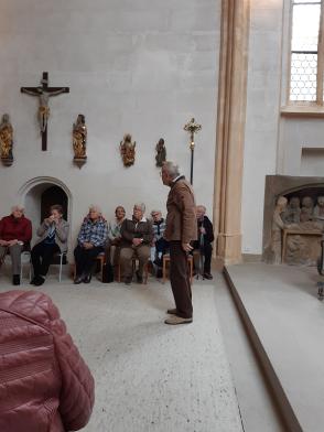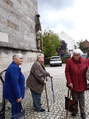 Die Führung begann mit Maria Magdalena dem neusten kleinen „Figürchen“ - Sie steht auf einem Sockel am Eck und blickt Richtung Kirchgasse, als wollte sie die Menschen zum Kommen auffordern! Dann wurde die Kilianskirche umrundet um den vertrauten Gesamt-Eindruck unserer Kilianskirche aufzufrischen! Im Inneren der Kirche hören wir viel über die Orgel, den barocken Altar, die wert- vollen Buntglasfenster und vor allem über unsere Brenck Kanzel. Pfarrer Ottmüllers Kirchenführung war interessant und kurzweilig - ausgeschmückt mit vielen persönlichen Erinnerungen. Pfarrer Ottmüller war schon als Vikar in Markt Erlbach und von 1985 bis 2003 Pfarrer bei uns.