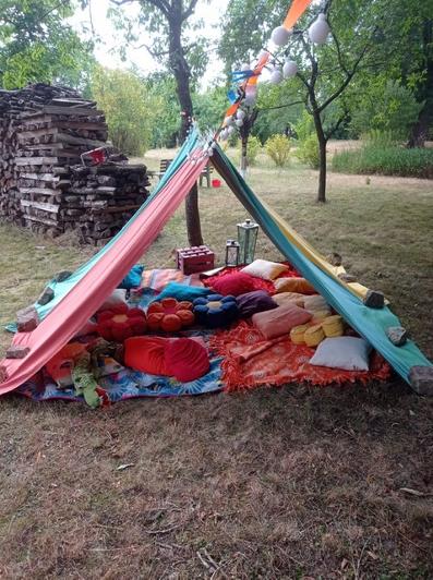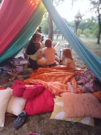 Musikalisch ging es in Punkto Lieder erkennen zur Sache. Ein Quiz mit verschlüsselten Liedtiteln sorgte bei vielen für Erinnerungen an die Jugend. Es weckte aber auch gleich den Wunsch nach einer Neuauflage mit neueren Hits, damit auch die aktuelle Jugend Chancen hat 😉! Durch verschiedene Geschichten und verschiedene Vorleser*innen hatten die Kinder immer wieder Gelegenheit, es sich in einem Zelt aus Stoffbahnen mit Kissen und Decken gemütlich zu machen. Es sah sehr einladend aus und die gespannte Zuhörerschaft genoss die Darbietungen sichtlich!