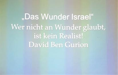 „Wer nicht an Wunder glaubt, ist kein Realist.“ So hatte es einst David Ben Gurion gesagt, der am 14. Mai 1948 mit der Unabhängigkeitserklärung den Staat Israel ausgerufen hatte. So erfüllten sich im Blick auf das Volk Israel – nach fast 2000 Jahren – die Verheißungen Gottes. Was Gott an Israel tut - an großen und kleinen Wundern – das kann auch uns Mut machen.