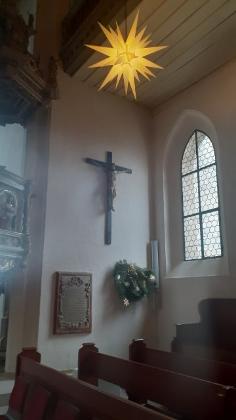 Eva liest noch eine lustige Geschichte vom Mesner und den Licht- und Schatteneffekten im Weihnachtsgottesdienst vor.