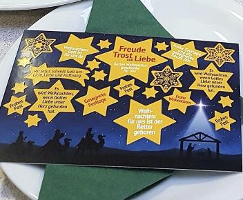 Die Mitarbeiter/innen hatten die Tische mit Zweigen, Sternen und einer Weihnachtskarte schön gedeckt. Hier gilt ein herzlicher Dank!