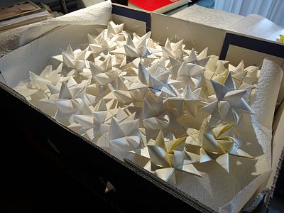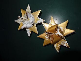 Einen kleinen Stern, der in meiner Kindheit unseren Christbaum zierte, hüte ich wie einen wertvollen Schatz. Der Stern ist vergilbt vom Rauch der Zigarren und Zigaretten - denn damals durfte man in den Gasthäusern rauchen. So eine Wirtschaft war mein Elternhaus! Da gab es kein Wohnzimmer - alles spielte sich im Gastzimmer ab. Wenn ich zurück denke: immer waren irgendwelche Leute bei allen Ereignissen dabei. Besonders am Hl. Abend waren wir nie allein - zu uns gesellten sich Einsame, Traurige. Problembeladene ….. Im Rückblick kann ich sagen. ES WAR SCHÖN!!! Basteln ist zwar für mich kein Hobby, aber dieser kleine vergilbte Stern hat mich beflügelt, für die Christbäume in unsere Kilianskirche einige Sterne anzufertigen. Da muss man lange vor Weihnachten damit beginnen - vielleicht war es zu früh. |