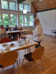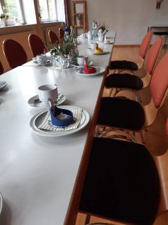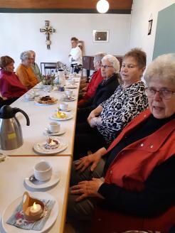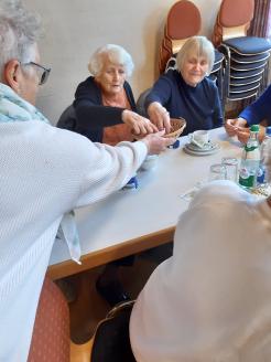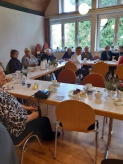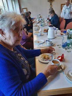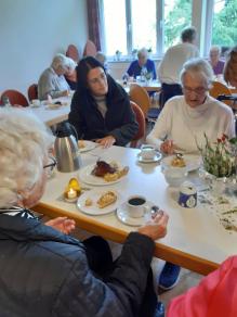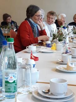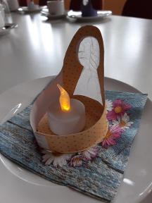 Auch im Gemeindehaus bei Kaffee und Kuchen rücken wir eng zusammen, so viele Gäste waren noch nie da. Ein Lichtlein bekommt als Andenken jeder mit nach Hause. Es wird von zwei Armen eingeschlossen und soll die Geborgenheit in Gott zeigen.